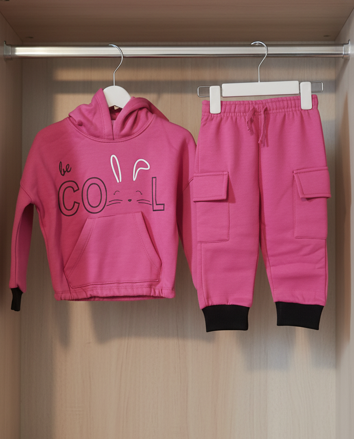 Keep your little one cozy and stylish with our “Be Cool” Pink Bunny Tracksuit. Made from soft, breathable cotton-blend fabric, this adorable two-piece set includes a hooded sweatshirt with cute bunny ear prints and matching cargo jogger pants. The elastic waistband and ribbed cuffs ensure a perfect fit and all-day comfort