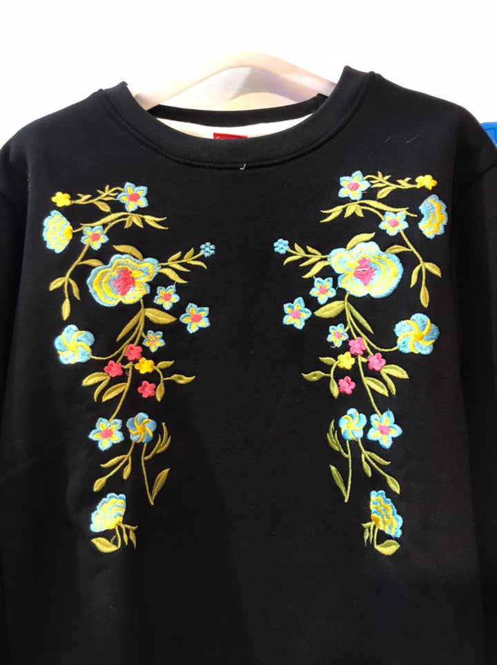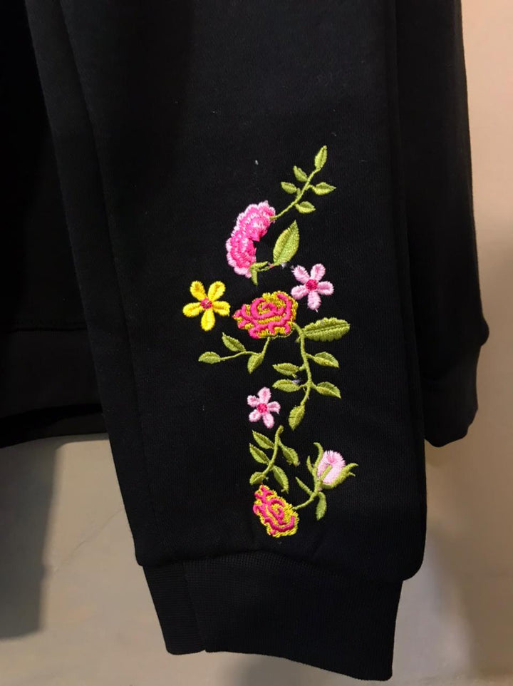 The black sweatshirt and joggers with floral embroidery look super comfy and stylish. The contrast of the colorful flowers against the black fabric is dope ๐.ย